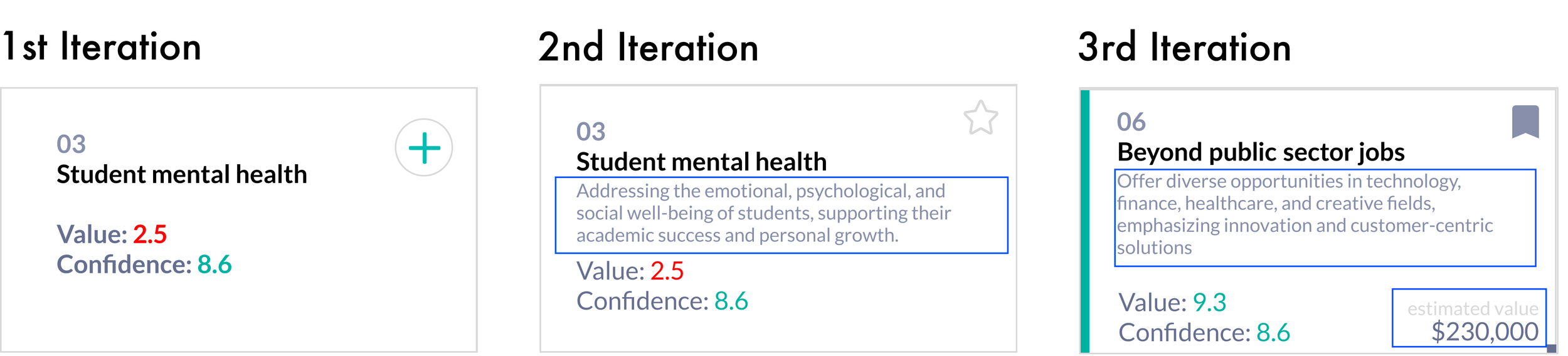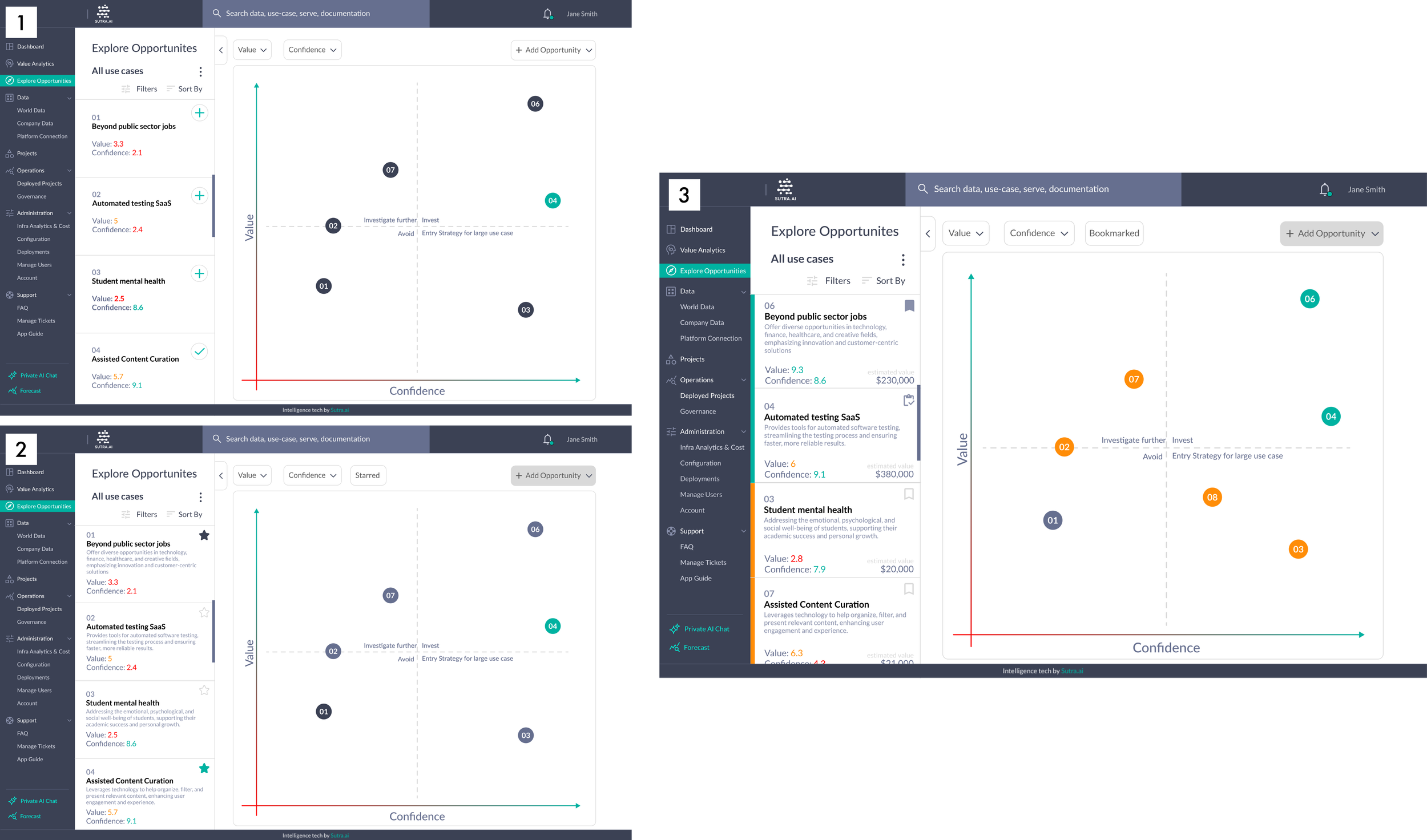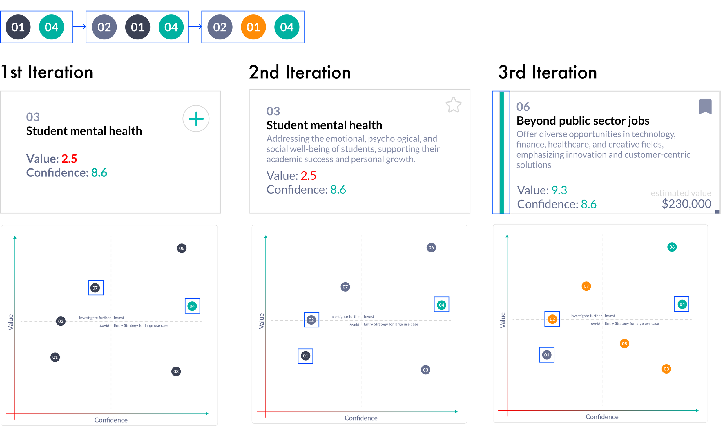 Design Translation: Used value and confidence metrics with clear, color-coded priorities (grey, orange, green) to make evaluating opportunities fast and intuitive.